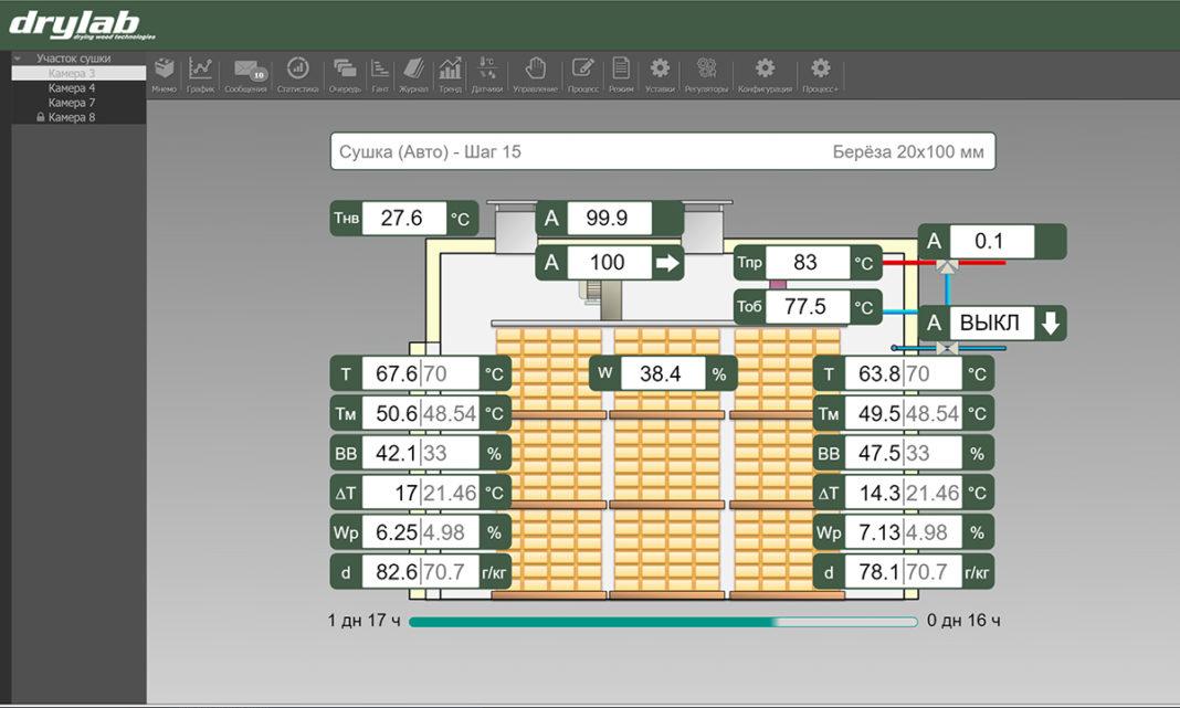 Диспетчеризация процессов сушки: издержки – ниже, эффективность – выше Основным отличием и преимуществом данной системы является сервис диспетчеризации технологических процессов сушки – аналога которого на текущий момент нет ни у одного производителя сушильного оборудования. Это дополнительный сервис, который мы реализовали для взаимодействия с пользователями нашей системы. Он позволяет оперативно непрерывно в режиме онлайн решать большинство задач, возникающих на участке сушки.