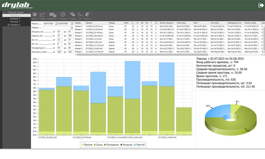 Наблюдения в режиме 24/7 позволяют системе фиксировать различные данные, в частности время простоя оборудования, что в свою очередь помогает собственникам оптимизировать бизнес-процессы. Оборудование должно не просто качественно работать, но и функционировать максимум времени. По имеющимся у нас сведениям коэффициент использования сушильного оборудования начинается от 30% и редко превышает 70%. Низкая эффективность имеющегося сушильного оборудования в ряде случаев заставляет предприятия проводить модернизацию путем увеличения количества сушильных камер, это требует огромных инвестиций и не всегда оправдано. Пример из практики: внедрение системы диспетчеризации на одном из предприятий снизило продолжительность штатного процесса сушки на пяти сушильных камерах зарубежного производства с 10–12 суток до 6–8 суток, то есть в 1,5–2 раза позволило увеличить производительность участка сушки без капитальных вложений на покупку новых сушильных камер.